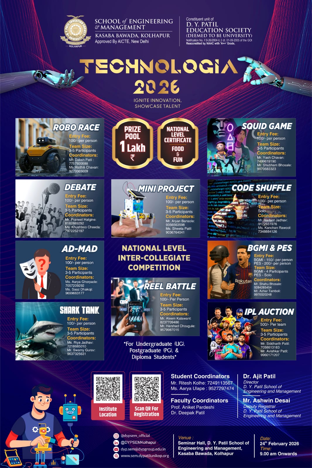 Explore Events and RegisterTechnologia 2026 is an annual National-Level Technical Fest hosted by D. Y. Patil School of Engineering & Management, Kolhapur. The fest is a hub of dynamic competitions, thought-provoking challenges, and opportunities to explore, create, and excel in various domains of technology and innovation.